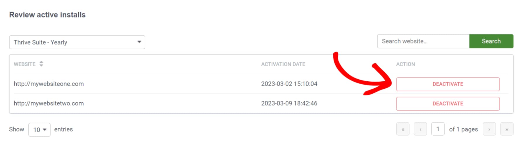 This is where you’ll see the Deactivate button appear beside each website name. You can go ahead and click on the Deactivate button for any site where you no longer want to use your license.