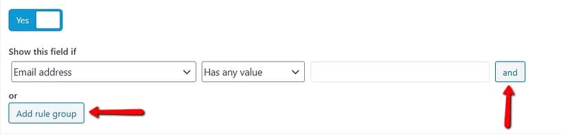 Once you do that, more settings will appear and you can use them to create rules that determine when the custom field is visible. You can set up one or more rule here, on an “and” or an “or” basis, using the different drop-downs, as well as the “and” and the “Add rule group” buttons: