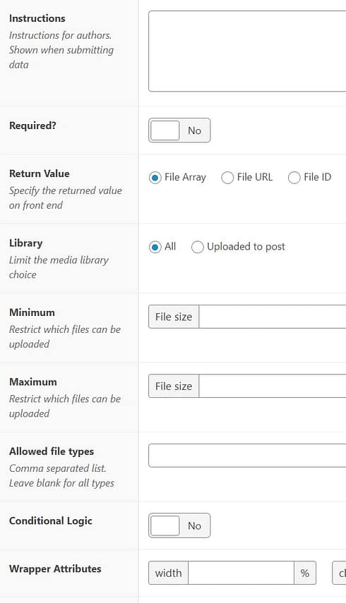 Furthermore, you will also see other settings that are specific to the “File” custom field type. Here are the details about how to use these: