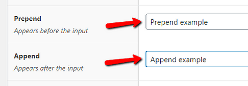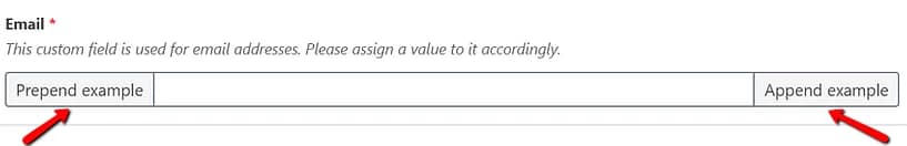 These settings can be used to add a visual text before (“Prepend”) or after (“Append”) the custom field. You can enter these texts in the designated fields from these sections: