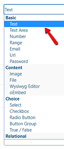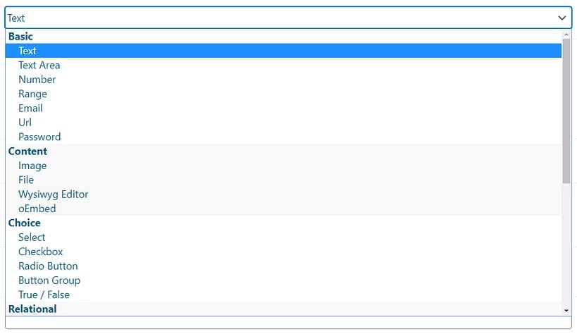 This will open a drop-down list with various field types you can choose from: