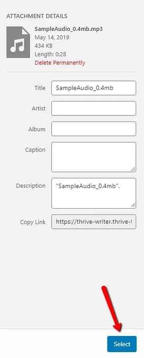 After you have chosen the file in the Media Library, click on the “Select” button, that appeared in the bottom-right corner, to add it as the value of this field: