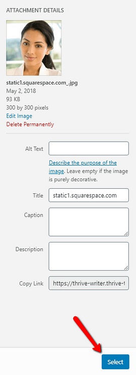After you have chosen the image, click on the “Select” button, from the bottom right corner of the Media Library: