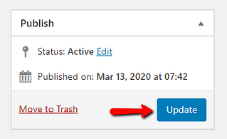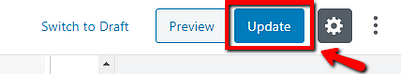 After you have finished assigning values to your custom fields, you need to update the post/page you are working on, in order to save the assigned values. To do that, click on the “Update” button, from the upper-right corner of the WordPress editor: