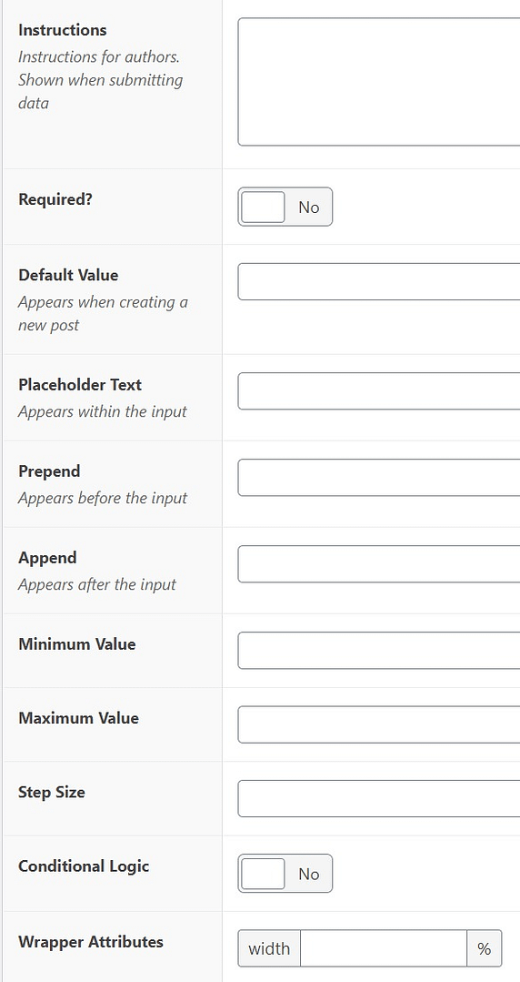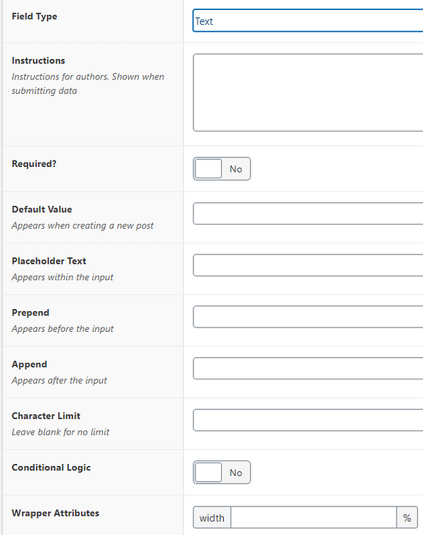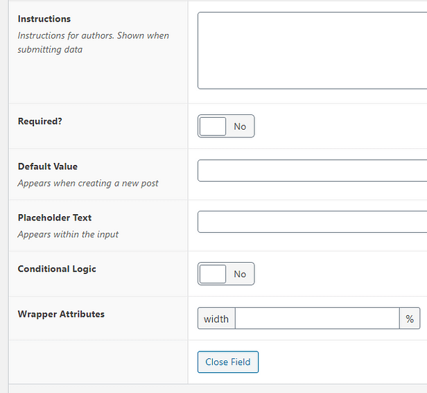 Some of these settings are general and will be available for every field type you set up for a “Field Group”.