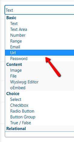 The “URL” field type is useful, if you will want to use this custom field as a hyperlink on your website, or if you want to use the custom field as the link for a video on your website. In order to add a “URL” custom field type, click on the “URL” option from the “Field Type” drop-down list: