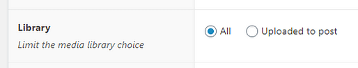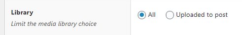 - You can either leave the “All” option selected in the “Library” section, which means that you will have the possibility to choose any file from the ones uploaded in the Media Library, as the value for the field.
