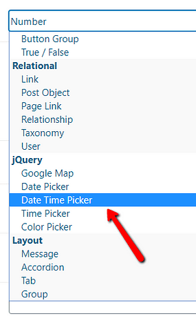 If you will want to display a date and a time (for e.g. while using the “Countdown” element) with your custom field, then you should pick the “Date Time Picker” from the “Field Type” drop-down list. You have to scroll down a little, to see it in the list:
