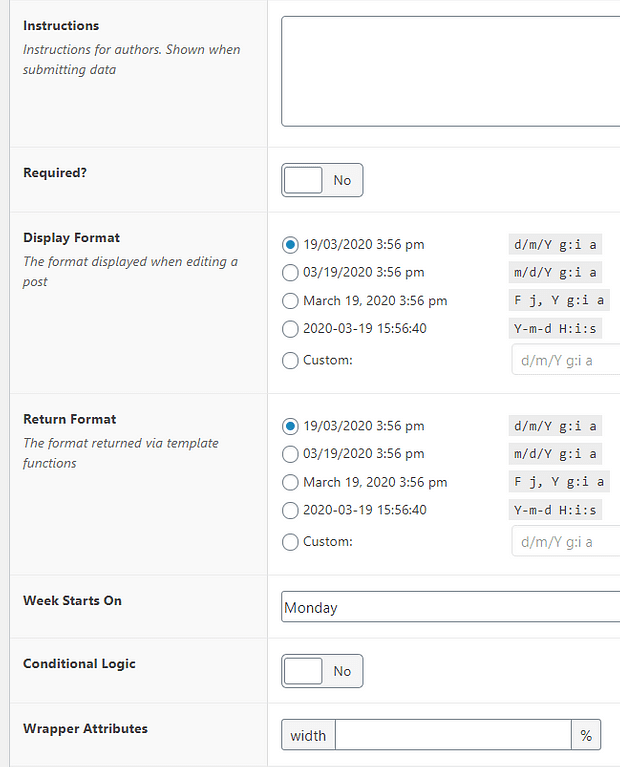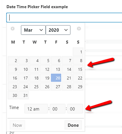 The majority of these settings are general settings. You can use these the same way as detailed for the “Text” field type above. Nevertheless, there are also three settings here that are specific for the “Date Time Picker”. Here is how you can use them: