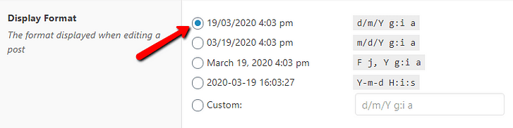 The “Display Format” setting lets you choose a date and time format for the field you are setting up now. The format you select here will be used when you will assign a value (select a date and time) for the custom field in your WordPress editor.