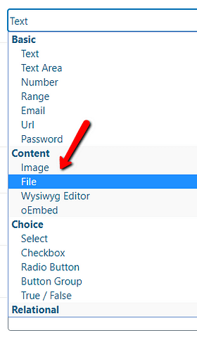If you leave this section empty, it will be possible to choose any file type as the value for the “File” field.