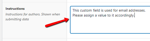 This section is useful if you want to give/leave instructions regarding how to use this custom field, for the authors of your website. Complete the “Instructions” section with the text you want: