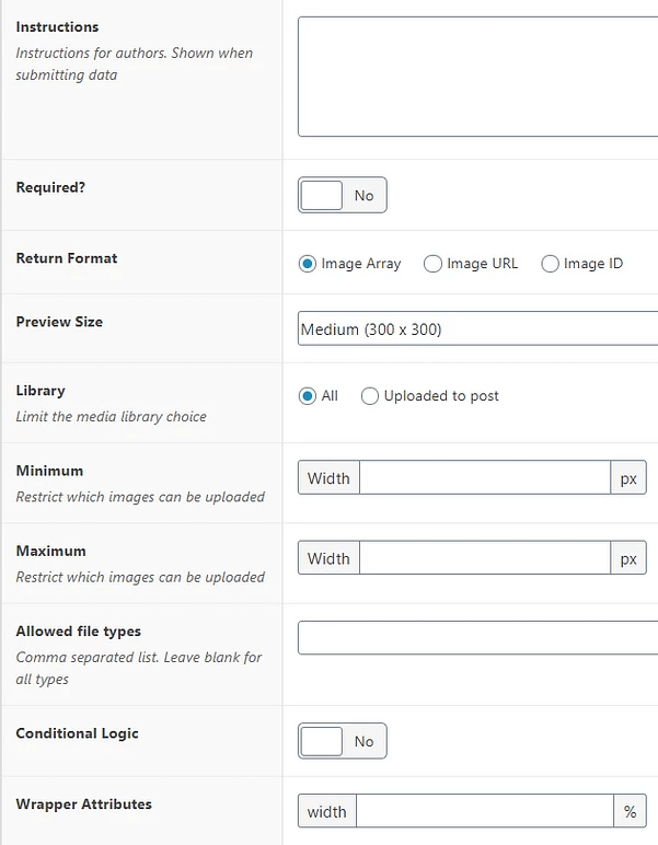 The “Minimum” and “Maximum” settings refer to restrictions you can set up when it comes to the width, height, and file size of the image that will be the value of this “Image” custom field.