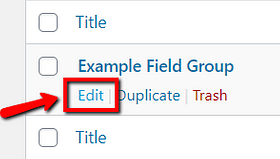 This will open your “Advanced Custom Fields” dashboard. Look for the “Field Group” you want to add the custom field(s) to. When you have found it, hover over it and click on the “Edit” option that appears: