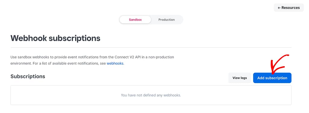 On the Webhook Subscriptions page, click the Add Subscription button on the right.