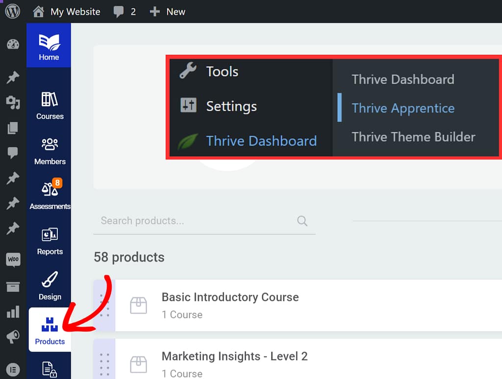 So, to link a Thrive Apprentice product with Square, begin by opening your WordPress admin area, navigate to Thrive Dashboard >> Thrive Apprentice, and click on Products in the left column.