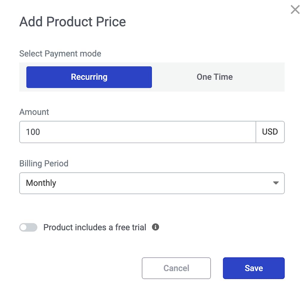 Under the recurring payment tab, enter the product price, the billing period and decide whether the product includes a trial period.