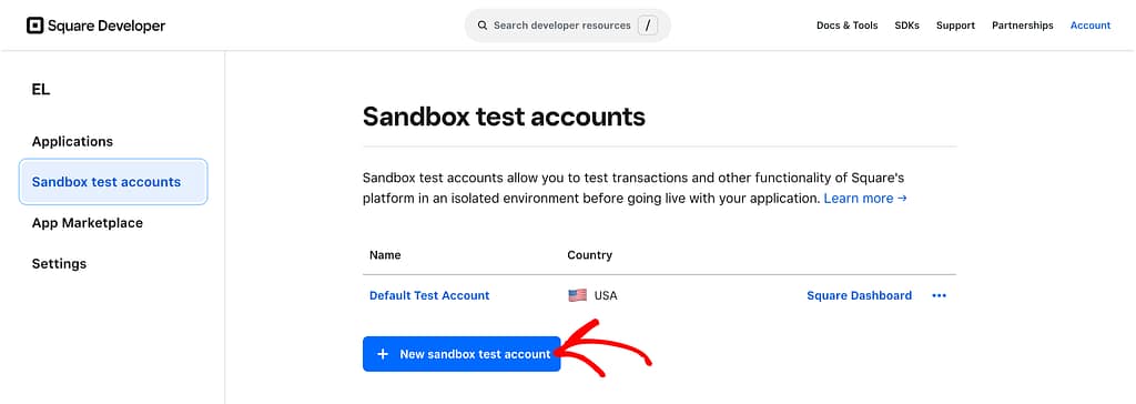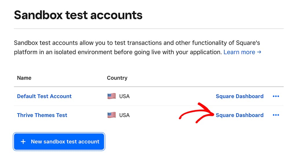 Once the Sandbox test account is created, click on the Square dashboard beside the test account you want to connect.