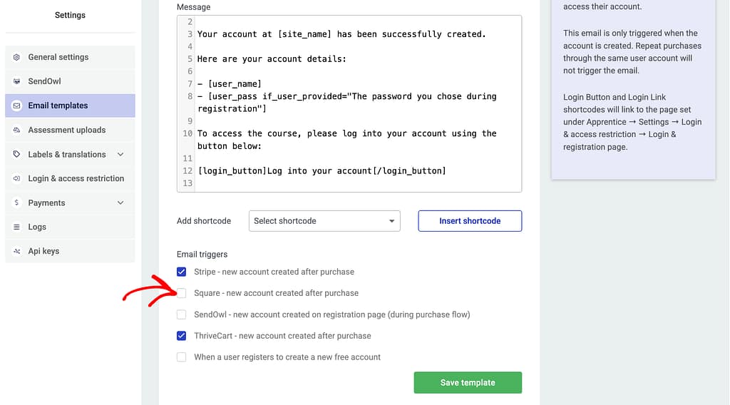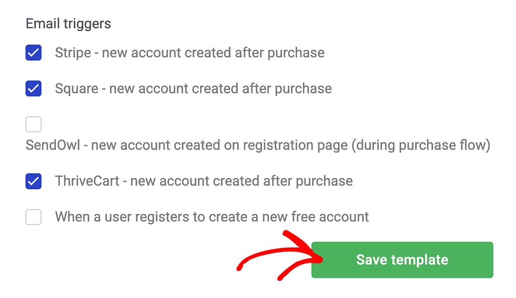When the New Account Created email template is opened, scroll down to Email triggers and check the box to enable Square – new account created after purchase.