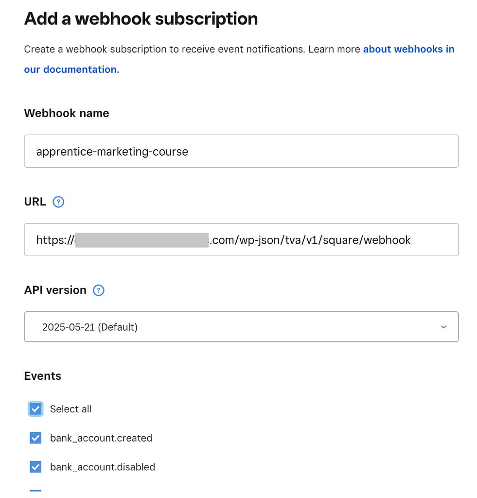 On the Square webhook detail page after clicking Add subscription, enter the webhook name, the URL you’ve just copied, and select all the events in the form.