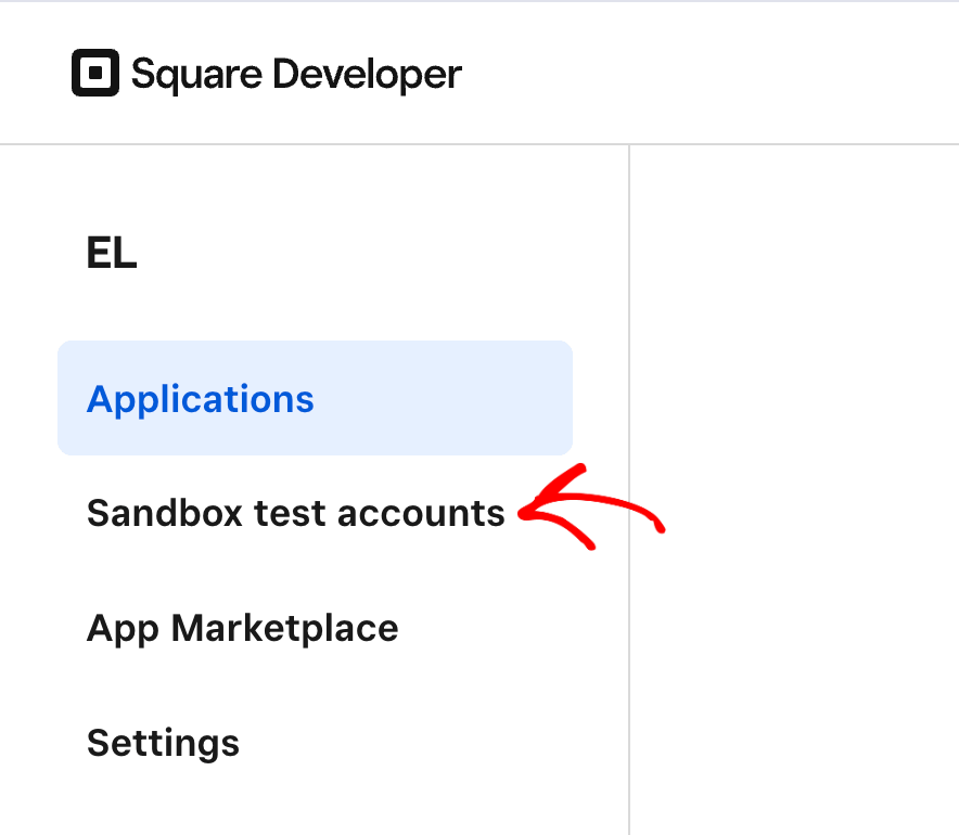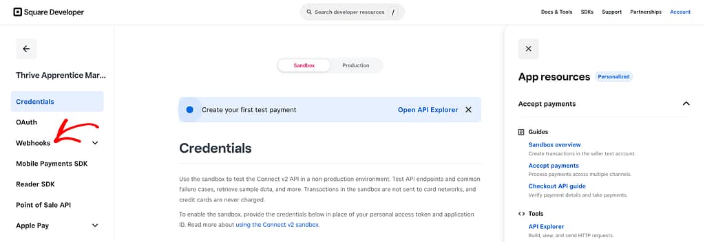 Before you click to Connect Sandbox from your Thrive Apprentice dashboard, open the Square developer console, and click on Sandbox test accounts in the left column.