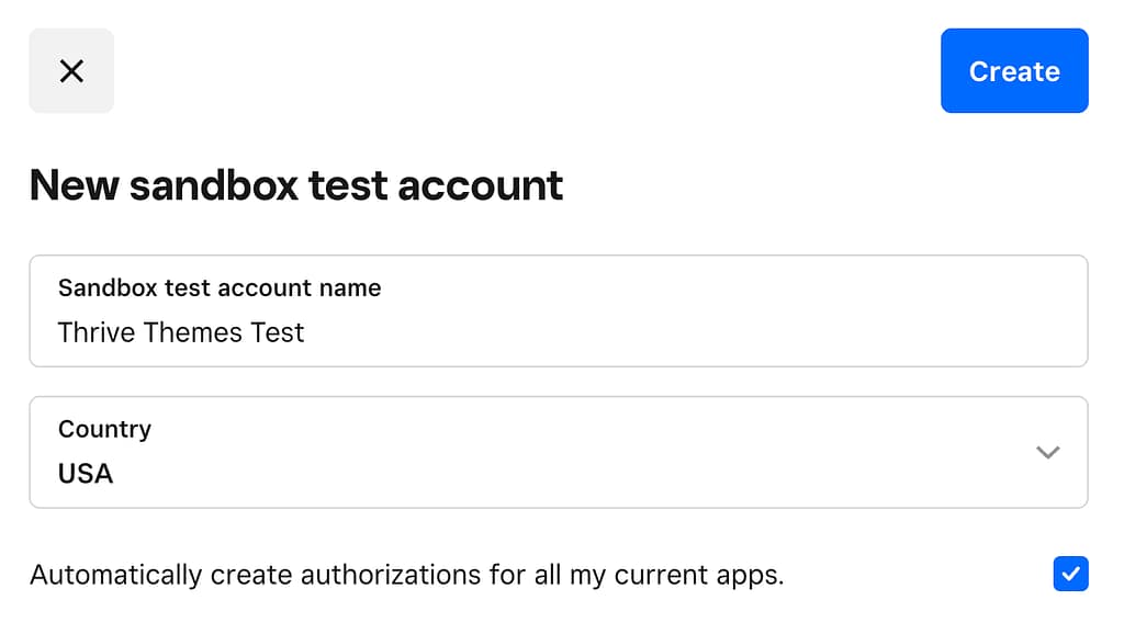 After clicking the button, enter the Sandbox test account name, select the country from the dropdown, and click the Create button.