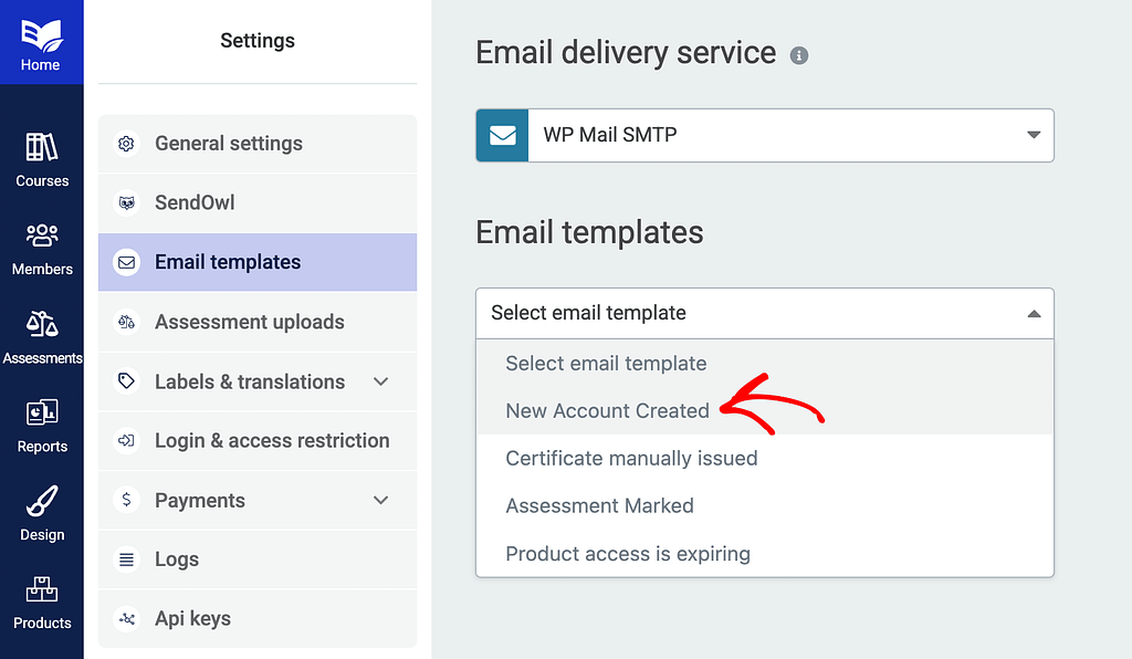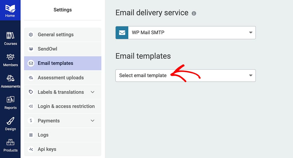On the Email templates page, click on the dropdown to select an email template.