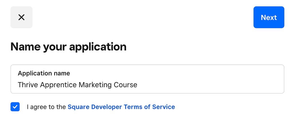 Clicking the plus icon will open a popup where you enter the Application name, agree to Square Terms and Conditions, and click the Next button.