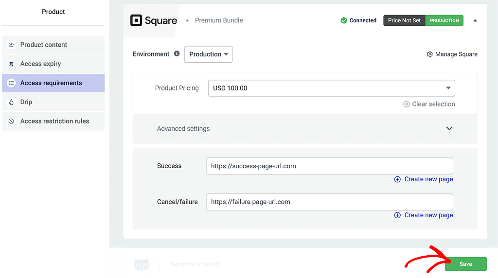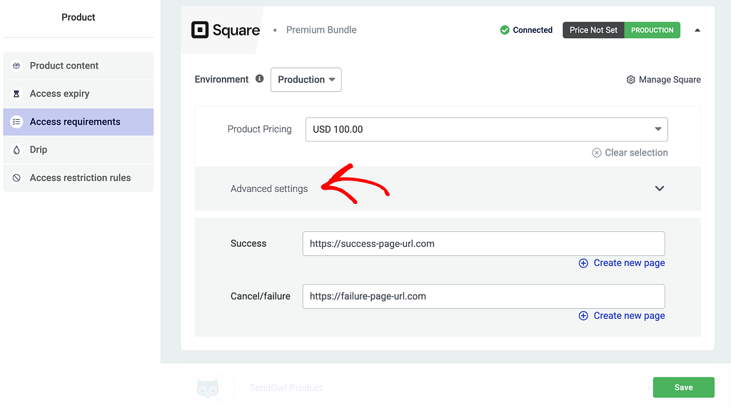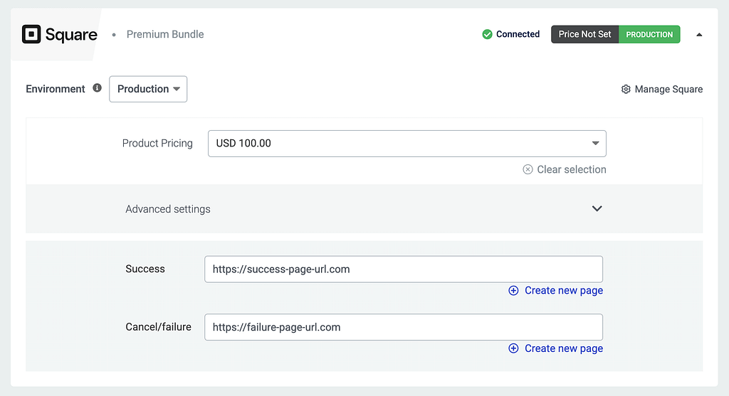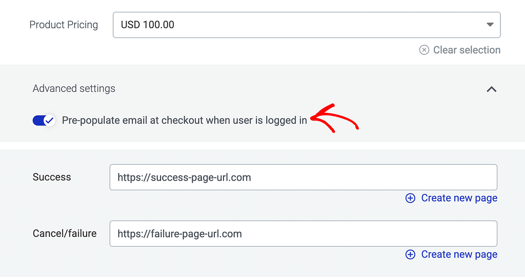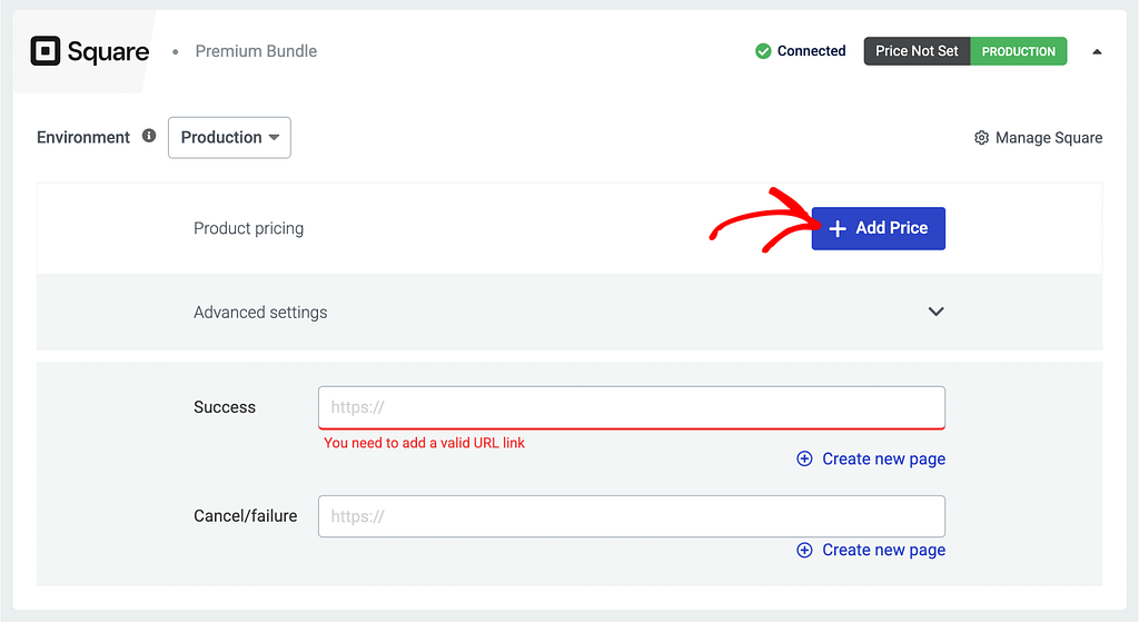 After you add the price, add a Success and a Failure URL in the fields below. These are the pages that will be displayed when the user purchases a product successfully or when a failure is encountered.