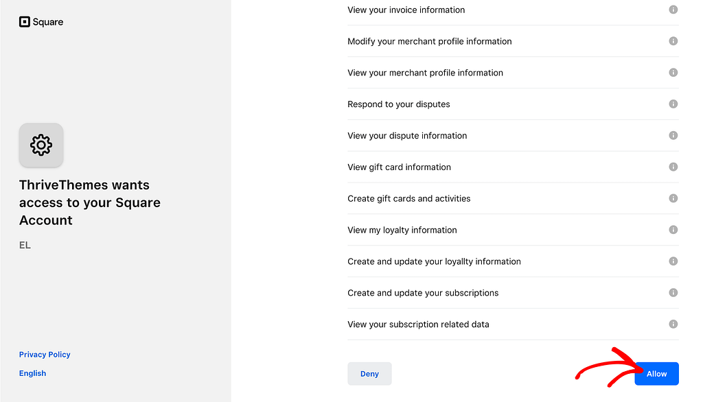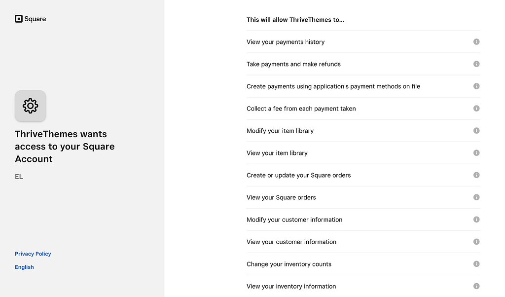 When you sign up or log into your Square account using the form, you’ll see a page asking you to grant permissions to Thrive Themes. This is a one time setting that is mandatory if you want to use Thrive Apprentice with Square on this website.