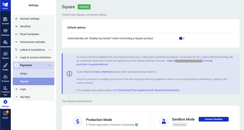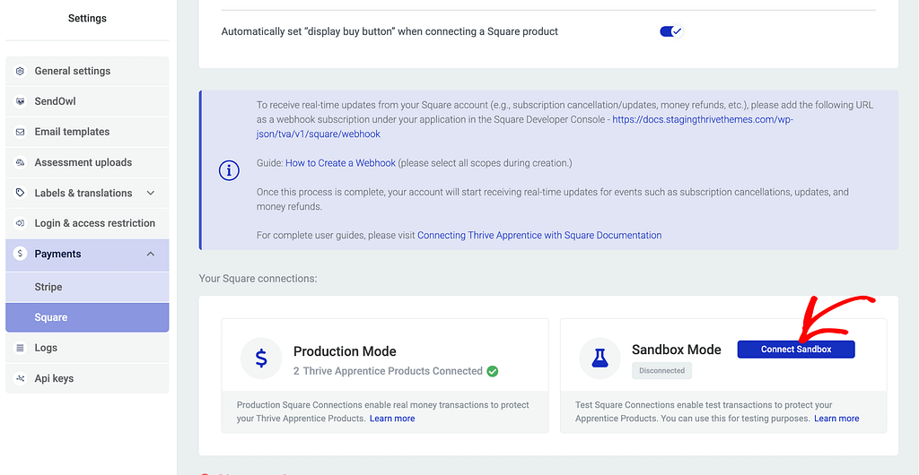 This will connect Thrive Apprentice to a Square Sandbox account that you can use to test the connection before pushing it live on your website.