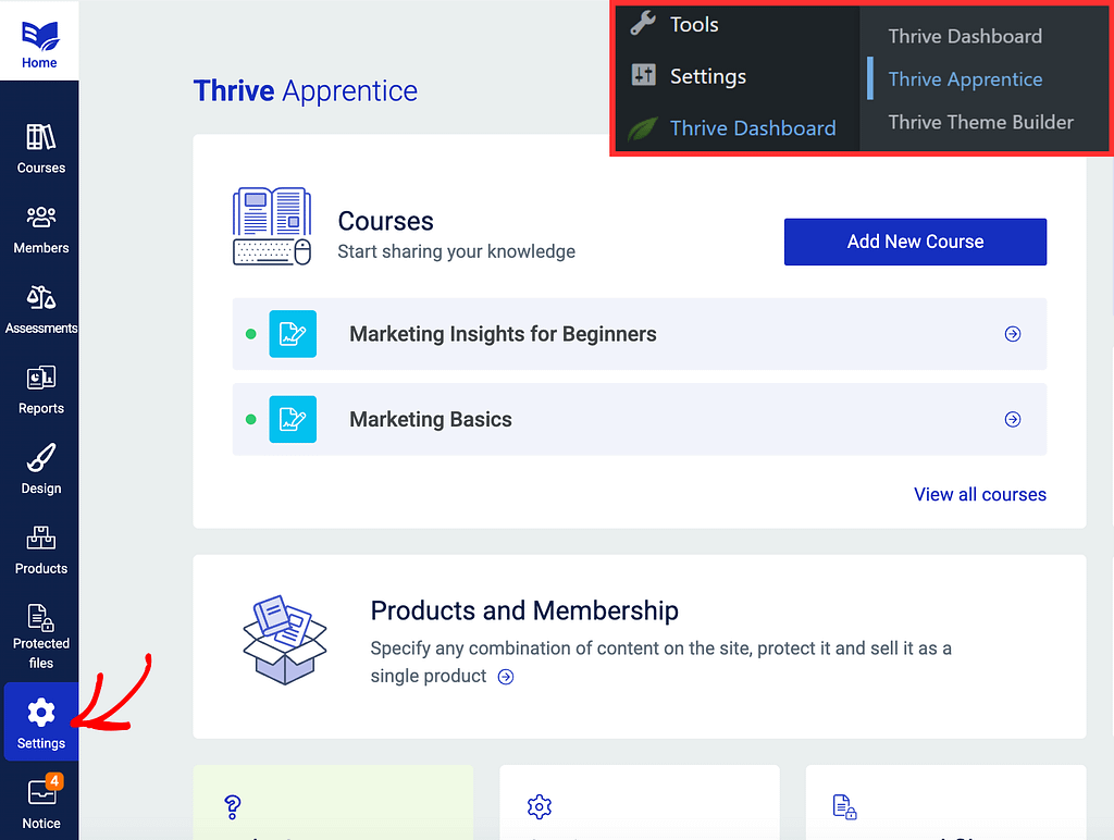 To do so, open your WordPress admin area, navigate to Thrive Dashboard >> Thrive Apprentice, and click on Settings in the left panel.