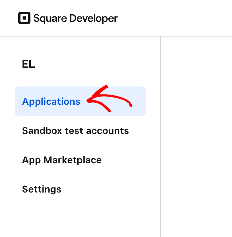 To create a webhook in Square, open the Square developer console, and click on Applications in the left panel.