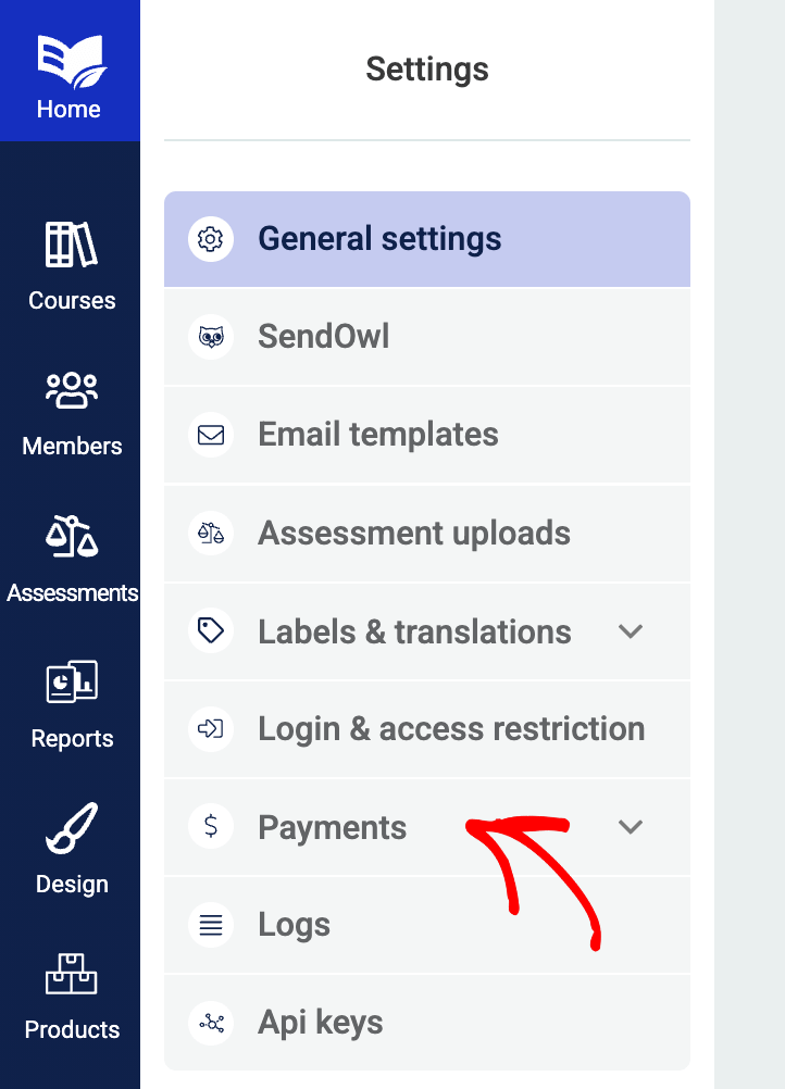 On the Thrive Apprentice settings page, click on Payments in the left column.