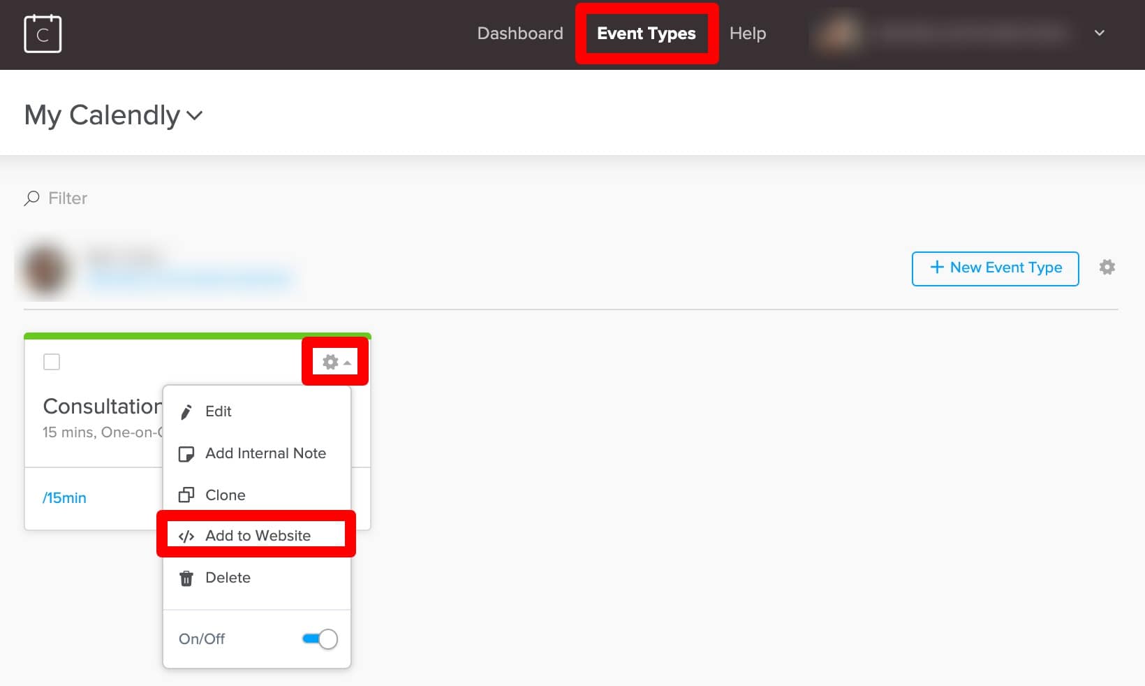 In your Calendly dashboard, click on the Event Types link in the top navigation bar. When the new page loads, click on the cog icon in your "Free Consult" Event box and select the "Add to Website" option from the dropdown.