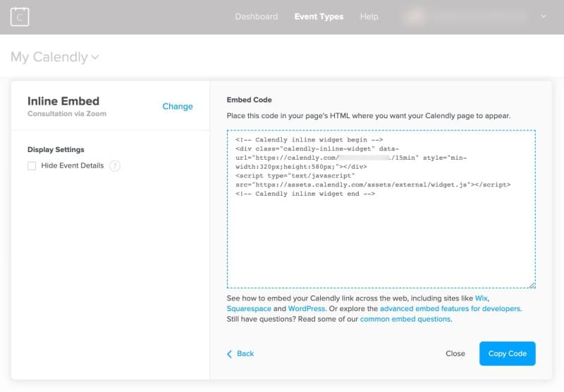 Finally, copy the HTML code Calendly provides you with (so you can paste it into your Thrive Leads ThriveBox Custom HTML element):