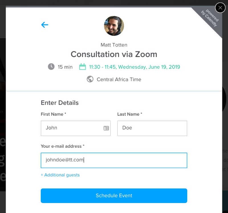 As a final step, clients will enter the information you require for your meeting like their name, email, Skype handle, etc. as well as any intake questions you may want them to answer (setup from your scheduling tool dashboard).