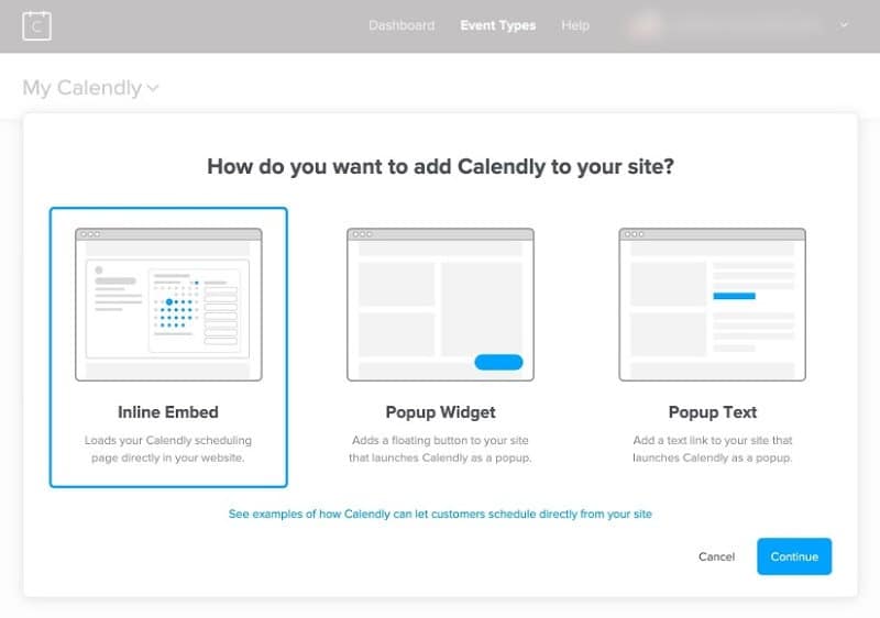 After that, click the Inline Embed option in the “How do you want to add Calendly to your site?” popup window that appears: