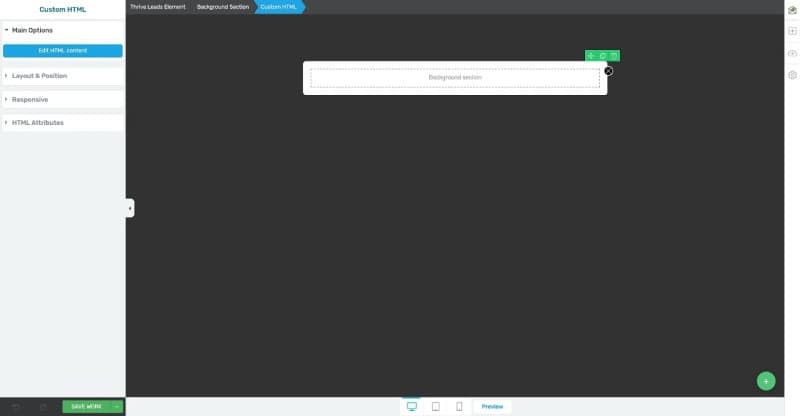 The "Blank Template" will load with a Background Section element inside a Thrive Leads Element. You'll need to add a Custom HTML element inside the Background Section and modify the Margin & Padding settings to be 0 pixels on all sides for each.