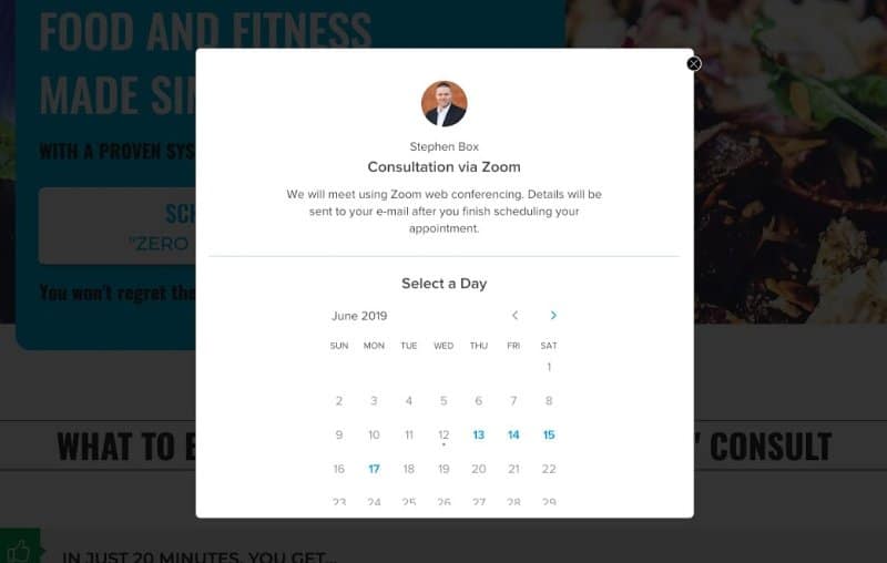 After completing the steps above, your New Coaching Client landing page should now show the following lightbox popup when visitors click on one of your “Free Consult” scheduling buttons:
