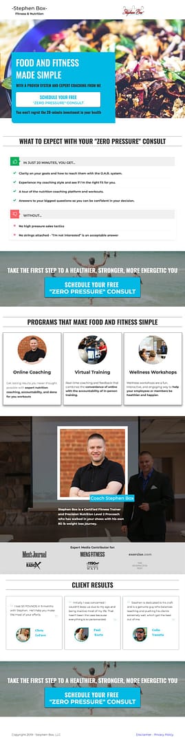 Stephen Box's New Client Landing Page. Notice how it streamlines visitors to click on his "Free 'Zero Pressure' Consult" scheduling buttons as well as his clever use of a "Pros & Cons" Content Block template.