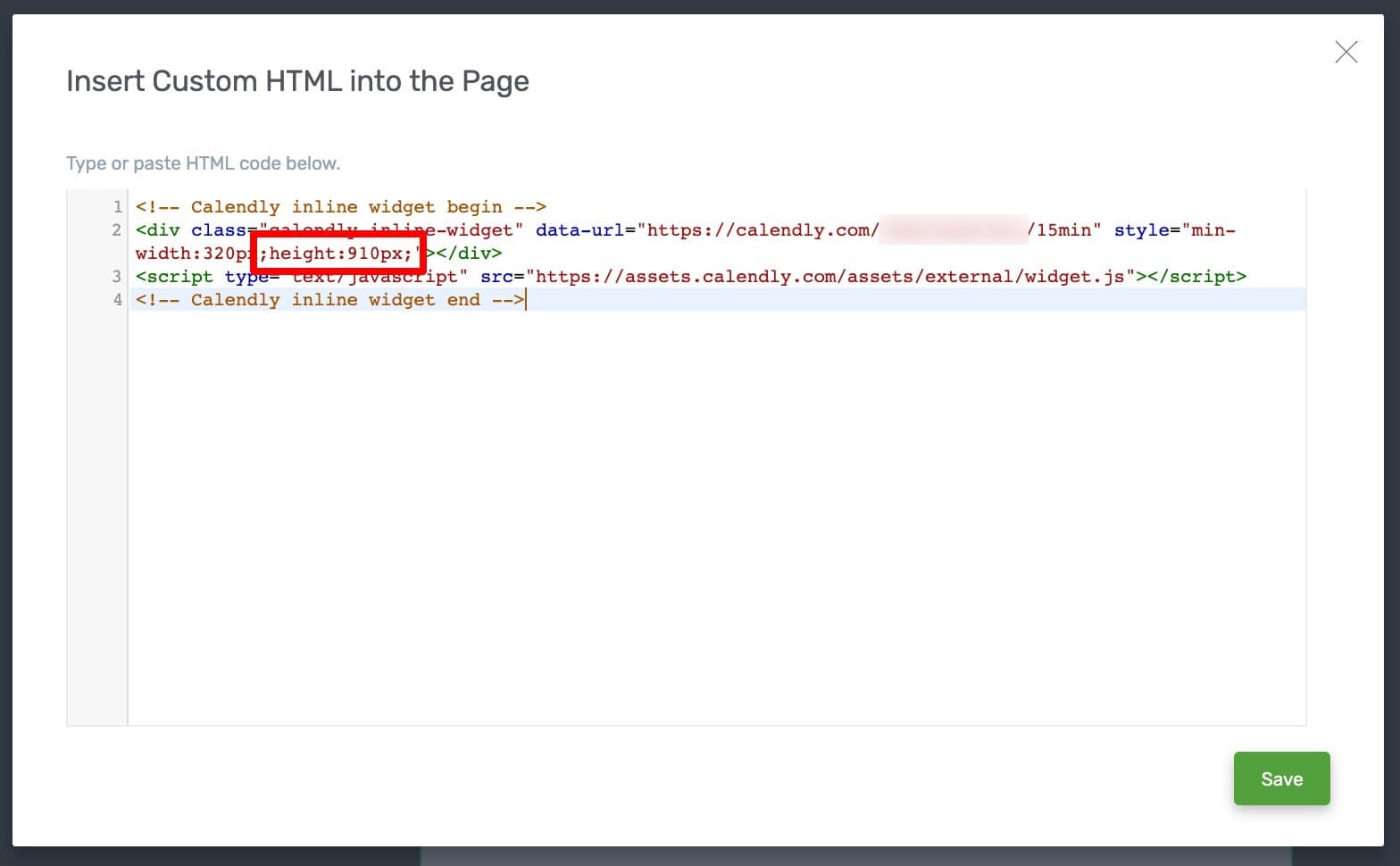 NOTE: You must also modify the height specifications (directly inside the HTML code) to match the Minimum Height pixel setting you set your Background Section and Thrive Leads Element to above (if using Calendly, I recommend changing the code to show height:910px):