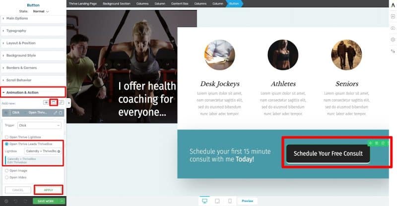 Load up your New Client Generation page in Thrive Architect and scroll down to your "Schedule Your Free Consult" button. Change the Action of the button to open your newly created ThriveBox on click.