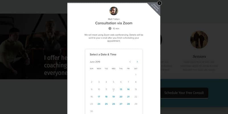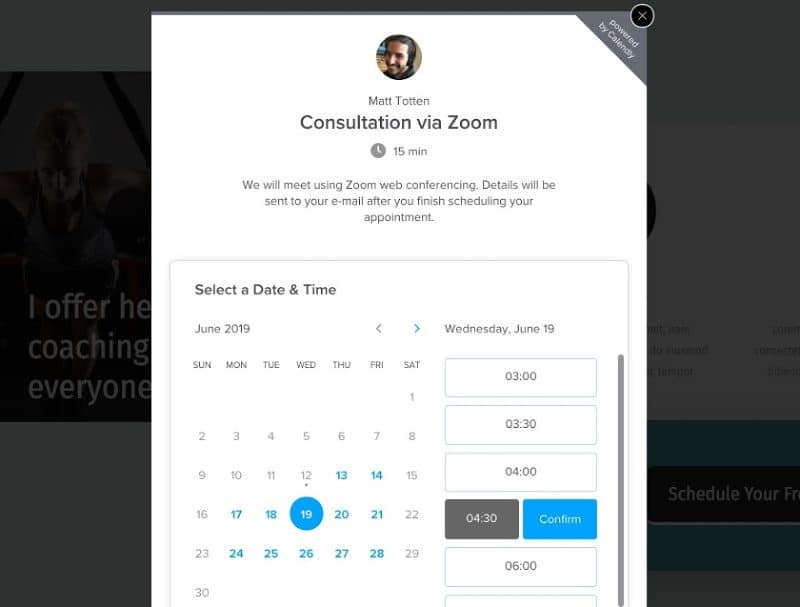 Without being directed away from your landing page, potential coaching clients can select one of your available coaching times and confirm their appointment: