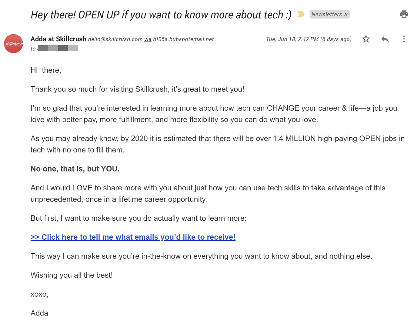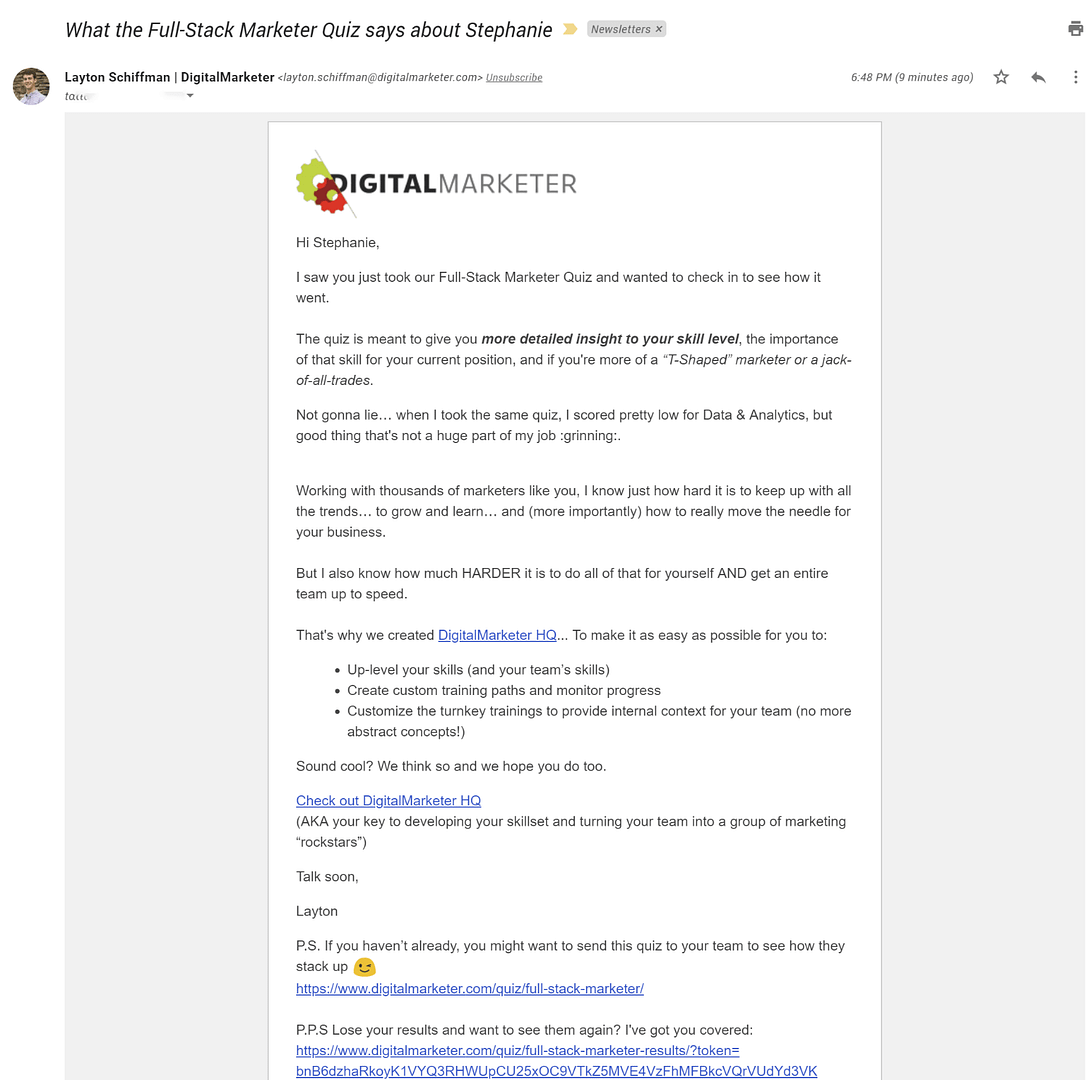 In this quiz funnel example, Digital Marketer is going immediately for the sale. However, it’s likely that if multiple offers for the course go ignored, new subscribers are simply added to Digital Marketer's regular email list.