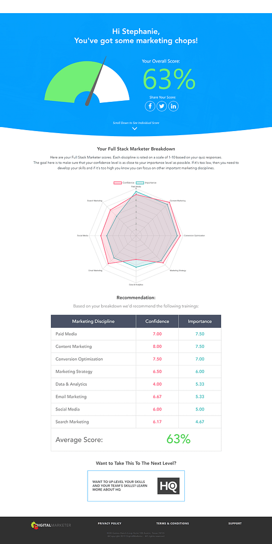 On top of that, look at this impressive and important looking results page Digital Marketer rewards their quiz takers with:
