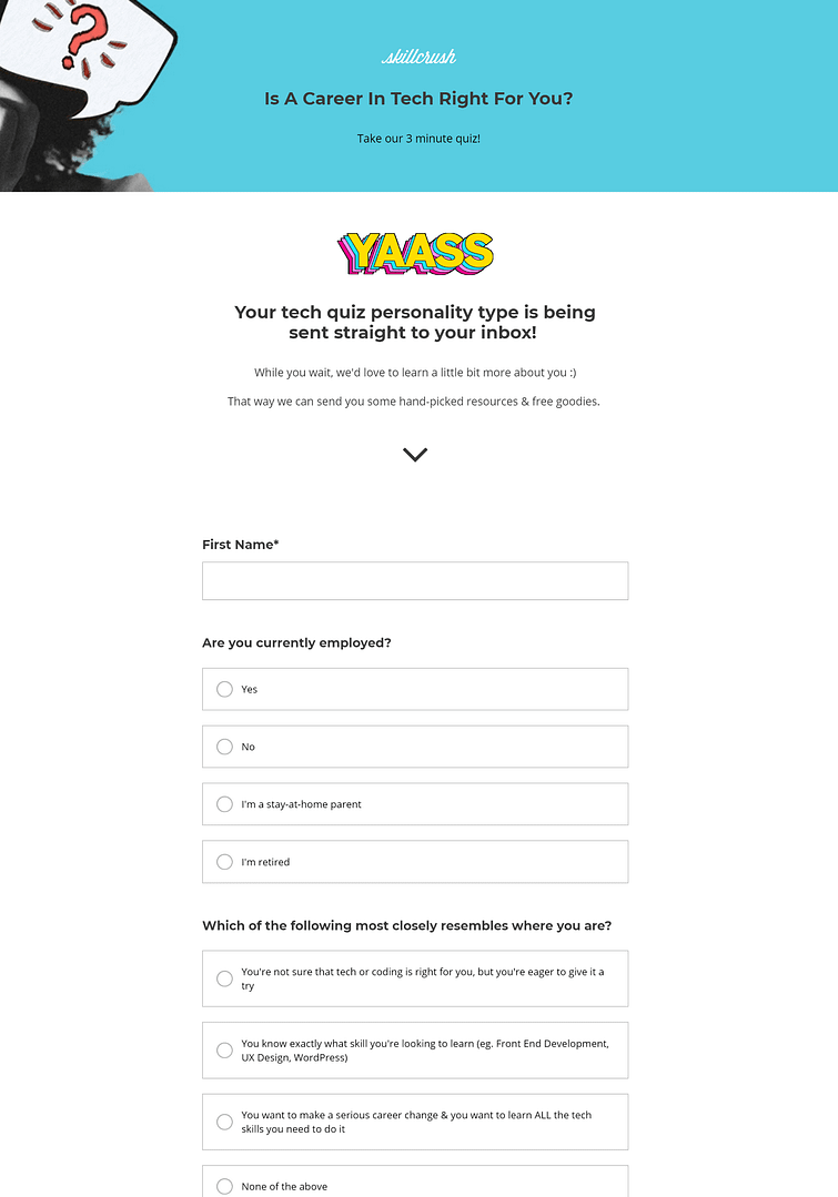 Because their quiz is boooorrring. I’m talking next level ‘feel like I’m writing a high school English essay’ boring. Without these two introductory pages, the drop off rates would be very high.