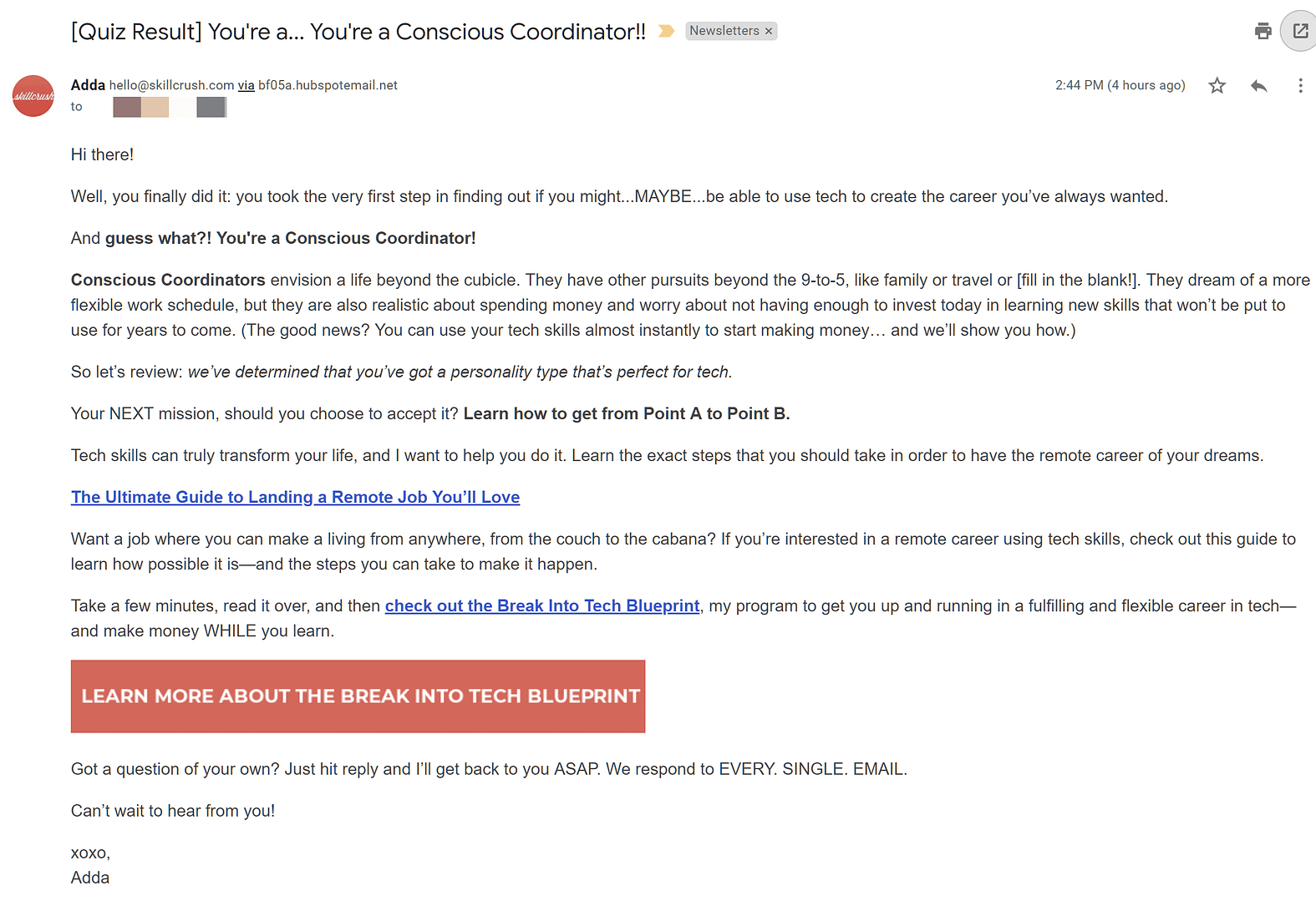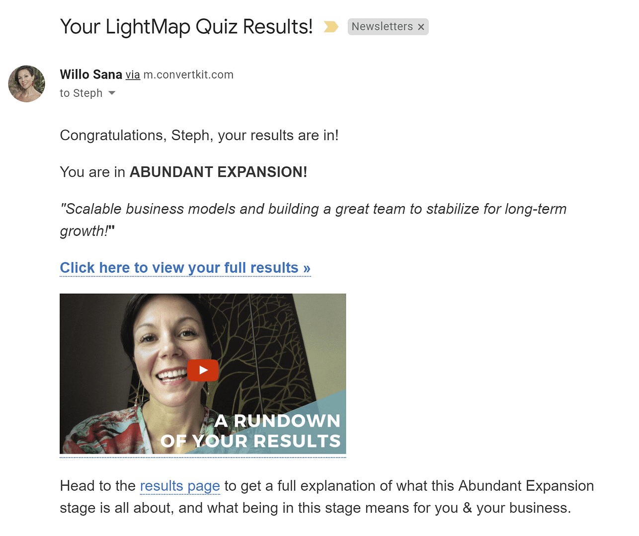 The quiz taker isn't just redirected to their Results Page, they also receive an email with their results too. The email provides a more in-depth analysis of their quiz results as well as another CTA for the paid course they were offered.