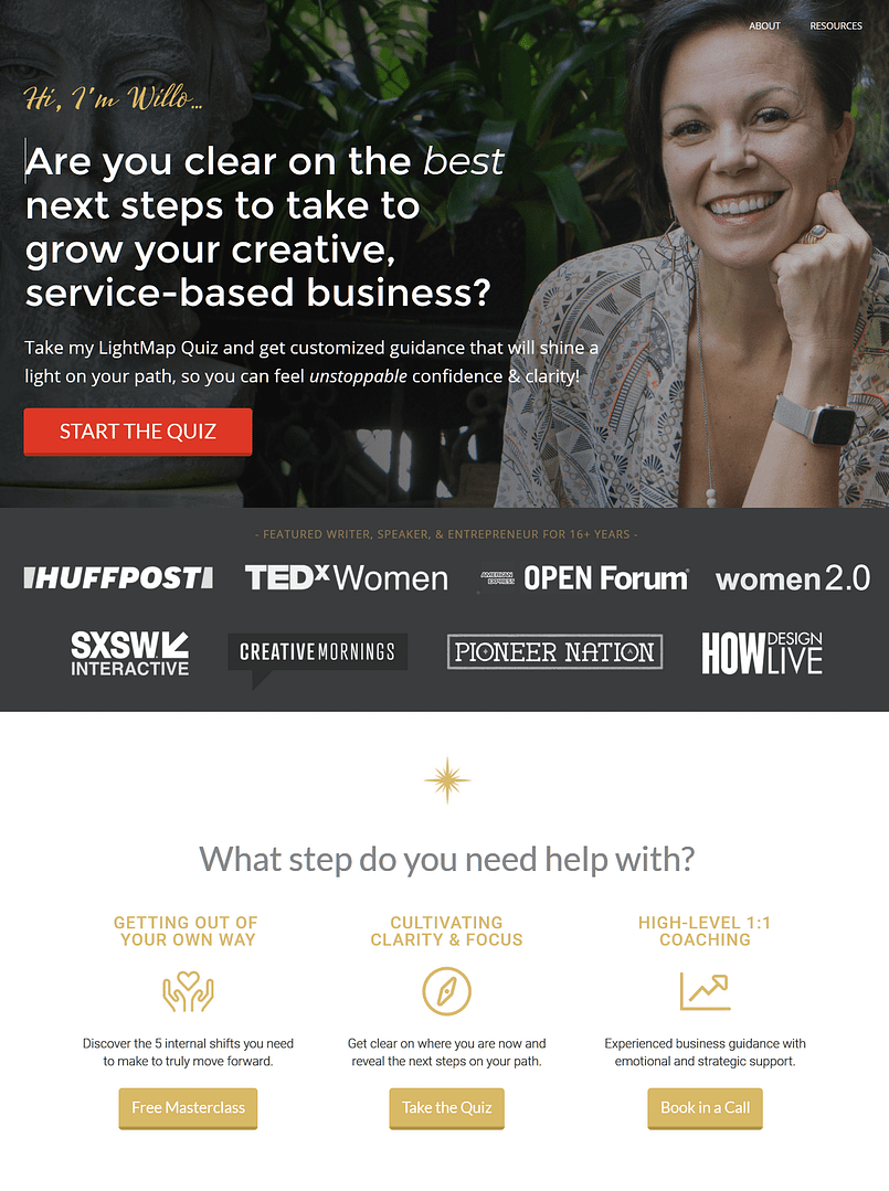 I learned that even the “big boyz” have room for improvement. None were perfect. All, I presume, are doing great with their funnels. I noticed that Willow has already added “Take our 3-minute quiz to find out’ to her splash page.
