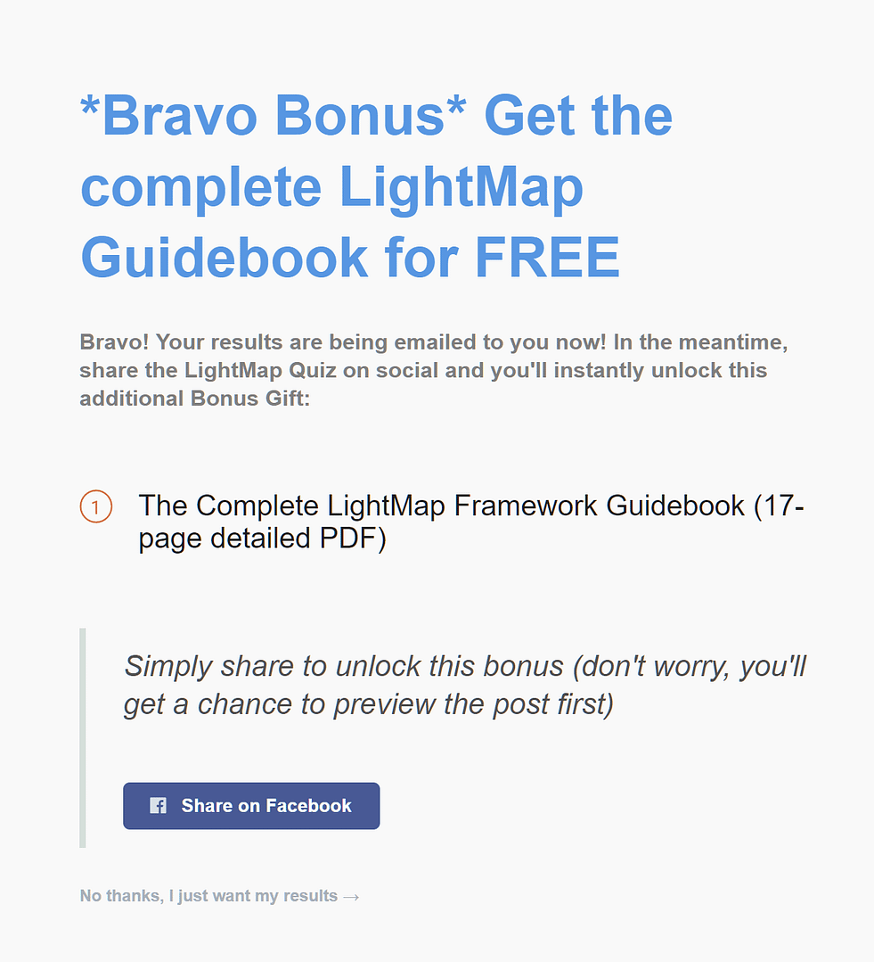 This page is here to prevent drop off during the quiz. It highlights all the valuable information the visitor will get in the results, encouraging quiz takers to get started and stick it out to the end.